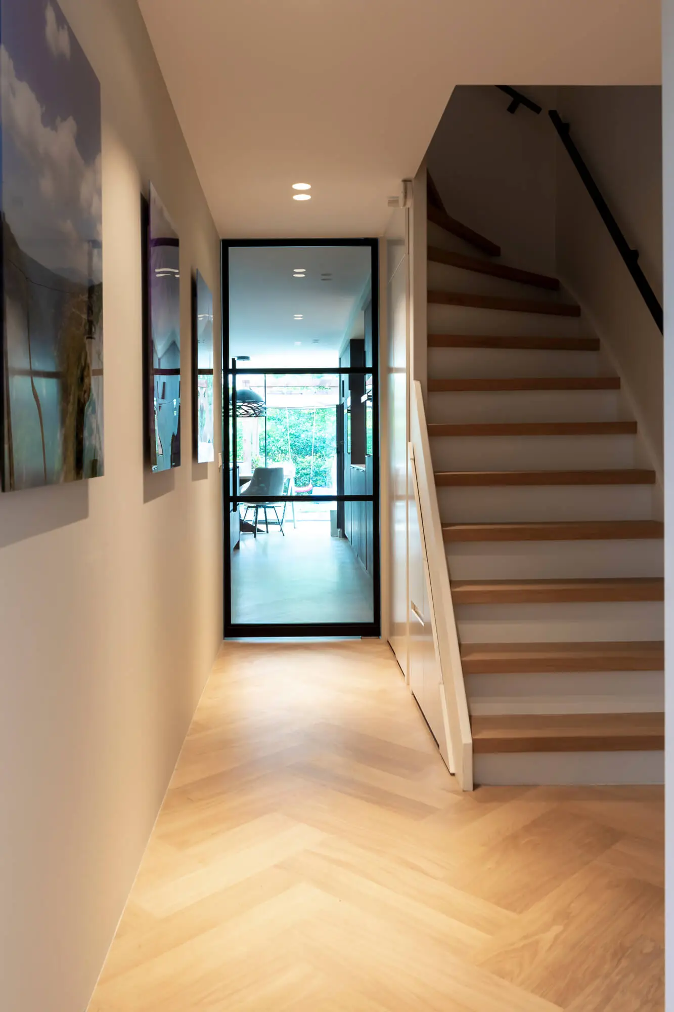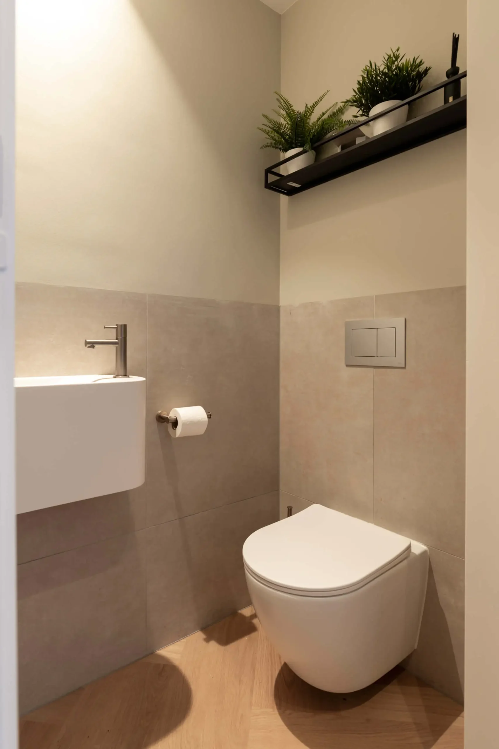 Op beide verdiepingsvloeren hebben we eiken laminaat gelegd en de begane grond heeft een massieve eikenhouten visgraat vloer gekregen. Ook in de badkamer is gekozen voor de warme uitstraling van eikenhout, in combinatie met ingetogen naturelkleuren.