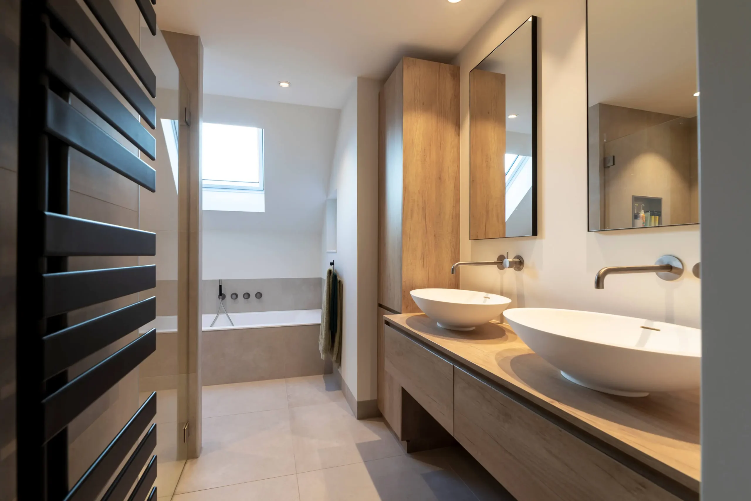 Voor de 1e verdieping is gekozen voor een compleet nieuwe indeling, waardoor de ruimte optimaal is benut. Zo ontstond er plek voor een nieuwe riante badkamer. Deze is uitgevoerd met een badkamermeubel met dubbele waskommen, een ingebouwd ligbad en een separate doucheruimte. Deze ruimte is afgeschermd met een glazen deur en voorzien van stijlvolle en gebruiksvriendelijke inbouwnissen.