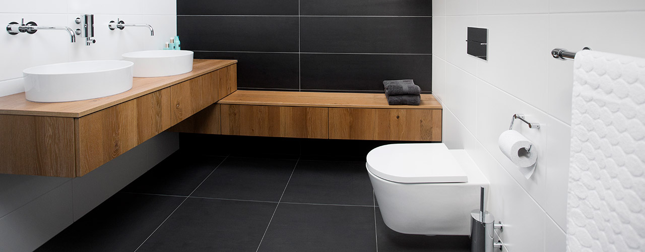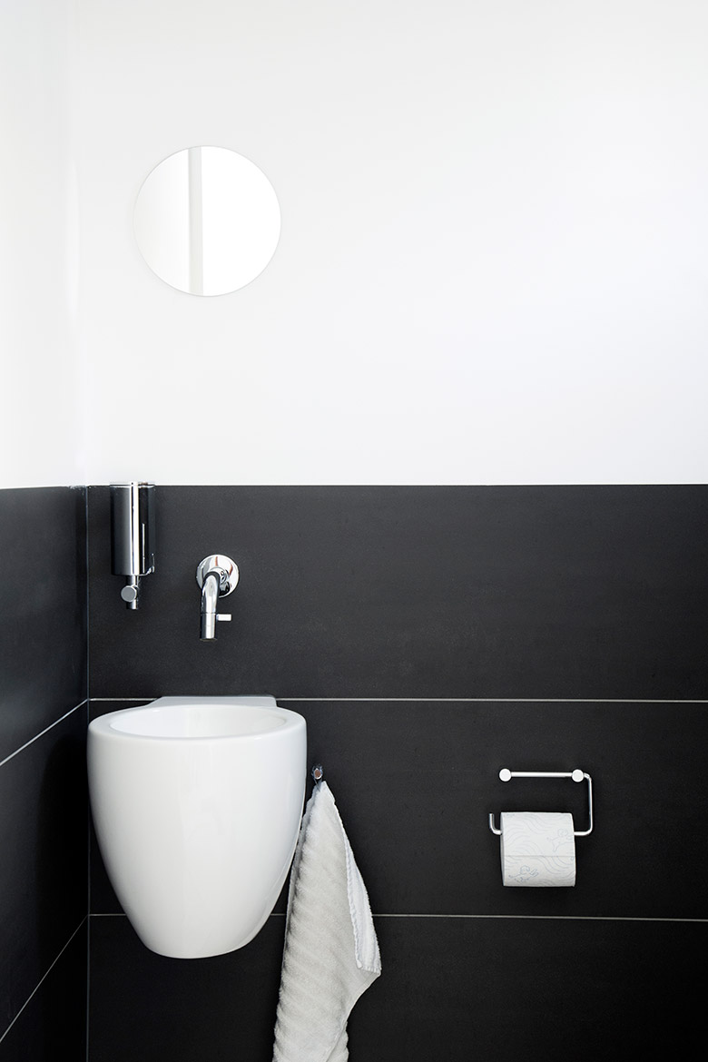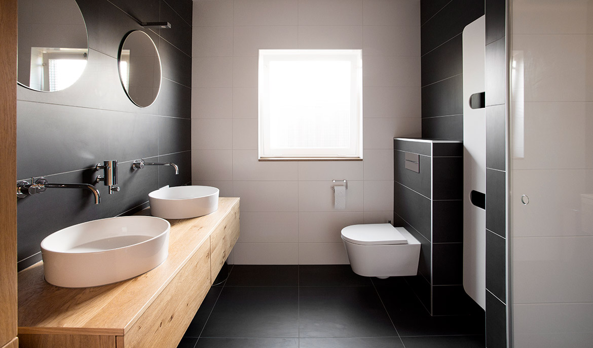 De keramische closets en de waskommen zijn van het toonaangevende Zwitserse designmerk Laufen, de chromen inbouwkranen en accessoires zijn van het Deense merk Vola. De vloeren en wanden zijn afgewerkt met XL-tegels van Mosa in wit en antraciet. De contrasterende kleuren worden met elkaar verbonden door de natuurlijke tinten van het hout, hetgeen de badkamer een uitgesproken en toch ingetogen karakter geeft.