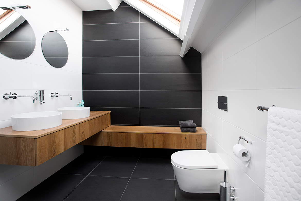 In het design voor de verbouwing van deze twee badkamers in een woning in Noordwijk is gekozen voor een tijdloze combinatie van zwart en wit, met eikenhoutkleurige accenten. Een van de badkamers is gelegen op de begane grond, de ander onder het schuine dak op de 1e etage. Het dak is voorzien van twee royale dakvensters, waardoor er veel daglicht naar binnen valt.
