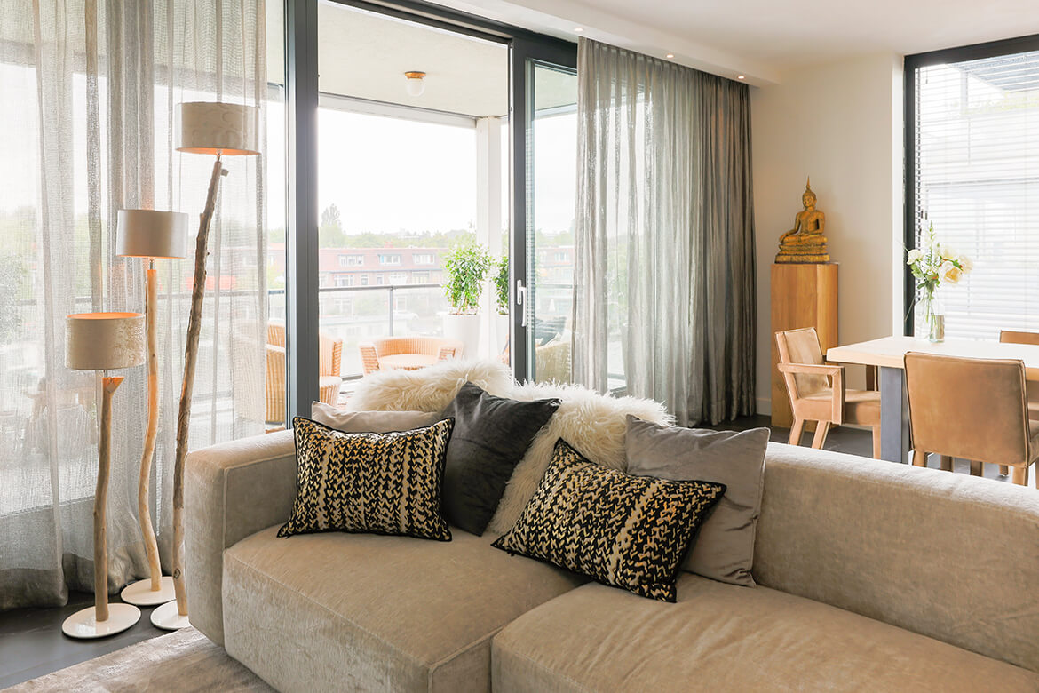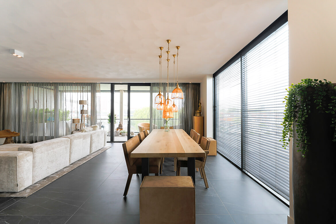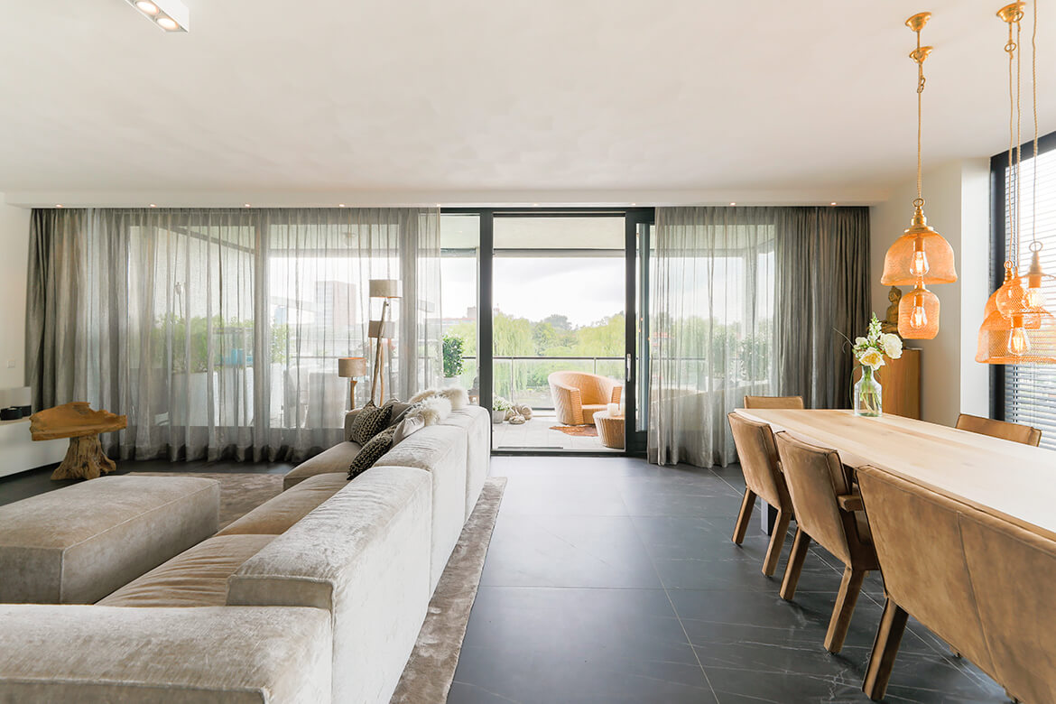 Voor dit appartement in Leiden verzorgden we in samenwerking met interieurontwerper Georgette de Bolster de complete vernieuwing van woonkamer en keuken. De ruime gelijkvloerse woning met kamerhoge raampartijen kreeg een exclusieve restyling. Met gebruik van moderne en natuurlijke materialen, antracietkleurige wanden en tegelvloer en koperkleurige accenten. Met een speelse en sfeervolle hanglamp met meerdere lichtbronnen boven een stoere eiken eettafel en een compleet lichtplan resulteerde de renovatie in een warm en stijlvol interieur.