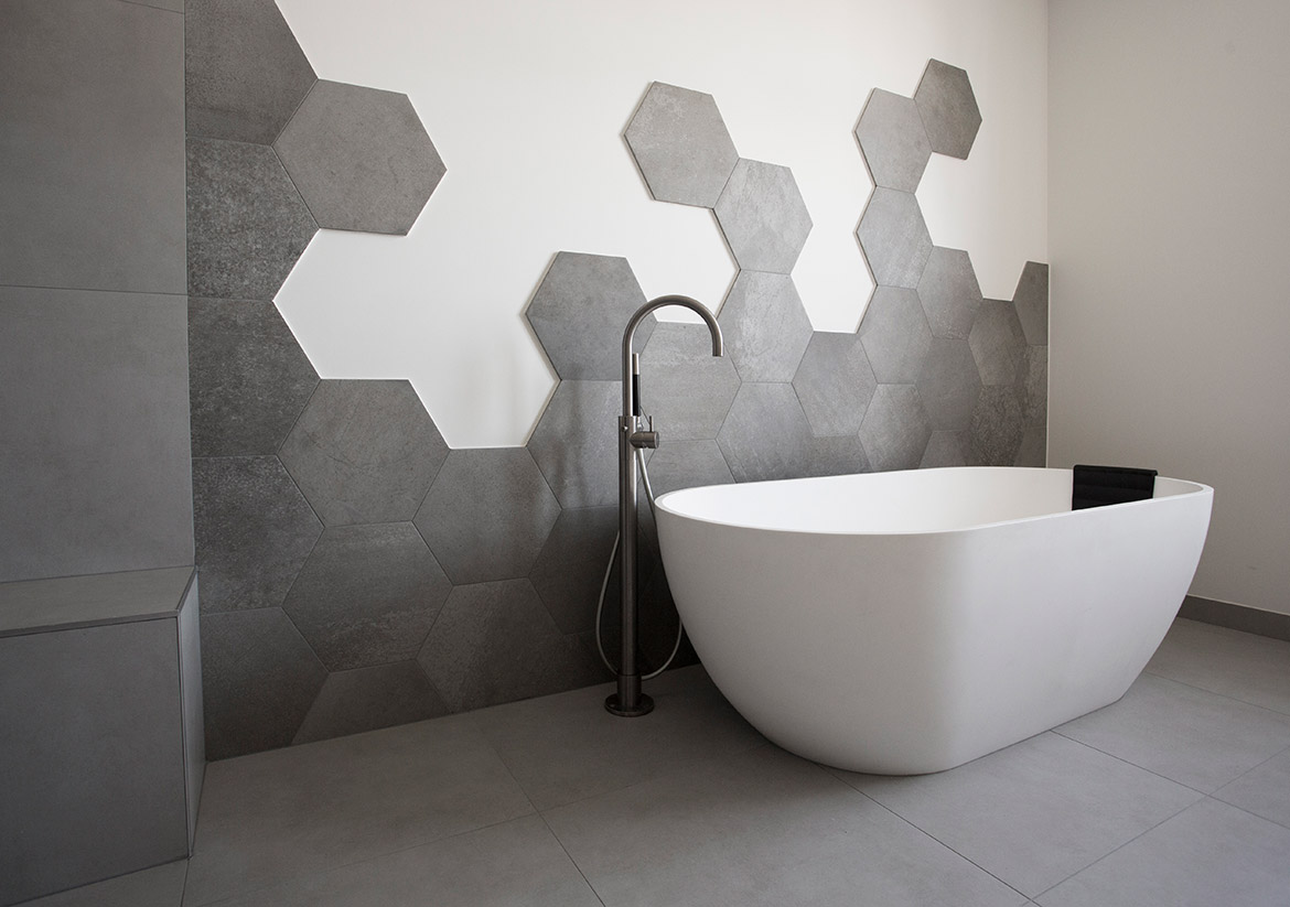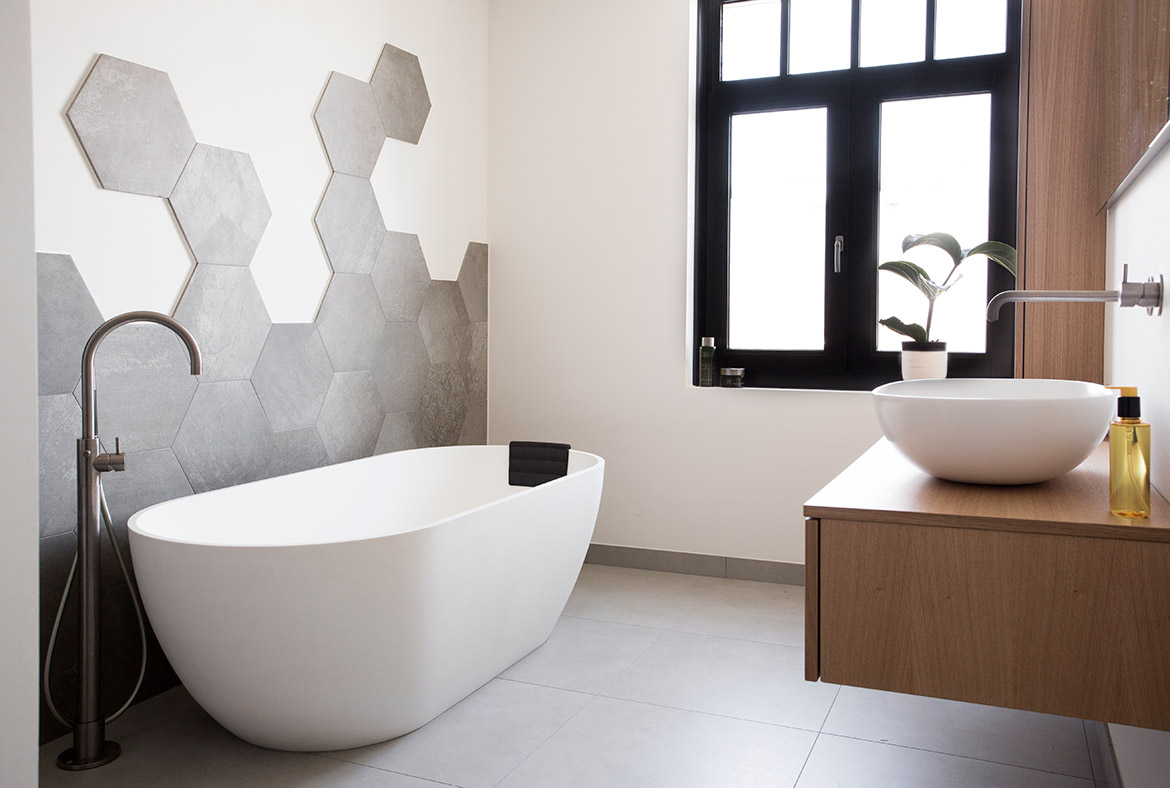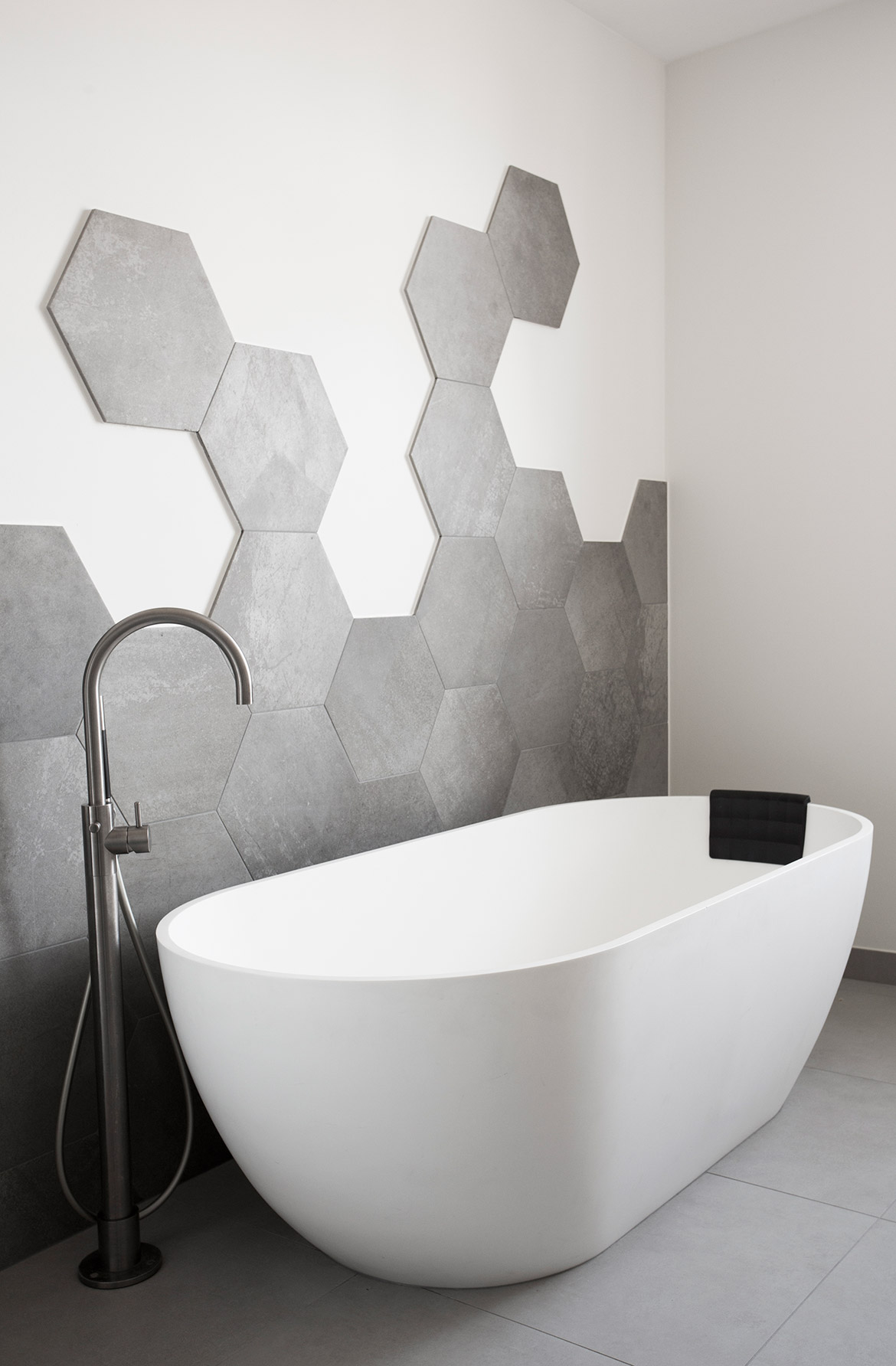 Het minimalistische ontwerp van een van de badkamers heeft een verrassend accent gekregen door de speelse toepassing van trendy betongrijze hexagon wandtegels. Zij vormen dé eyecatcher in deze slim ingedeelde badkamer. Het binnenvallende licht accentueert de fraaie belijning van het mat witte solide surface bad van RIHO met de stoere vrijstaande badkraan van Hotbath. Het ruimtelijk effect wordt extra benadrukt door de royale horizontale spiegel boven de waskom. De badkamer ademt de sfeer van ingetogen luxe.