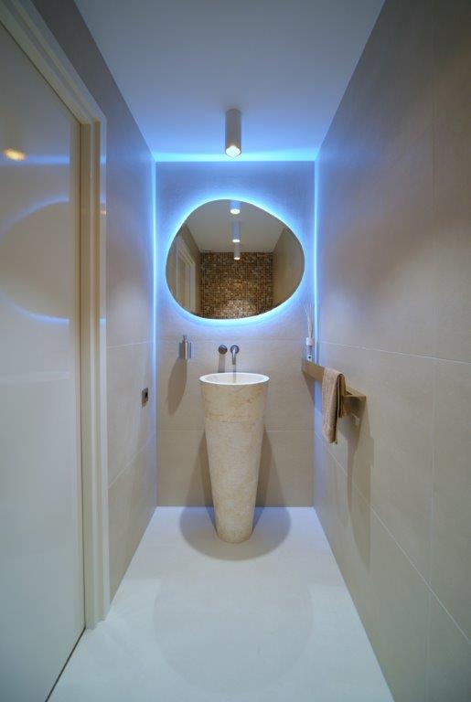 De basis voor het ontwerp van deze langwerpige badkamer waren twee badkamers, gelegen in elkaars verlengde. Het samenvoegen van de ruimtes en het ontwerp met schuifdeuren, maatwerk kasten en slimme nissen zorgen ervoor dat het oppervlak optimaal is benut.