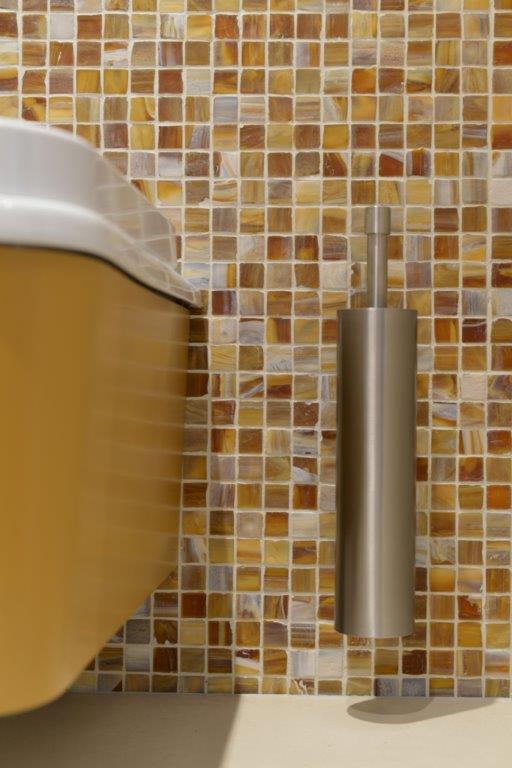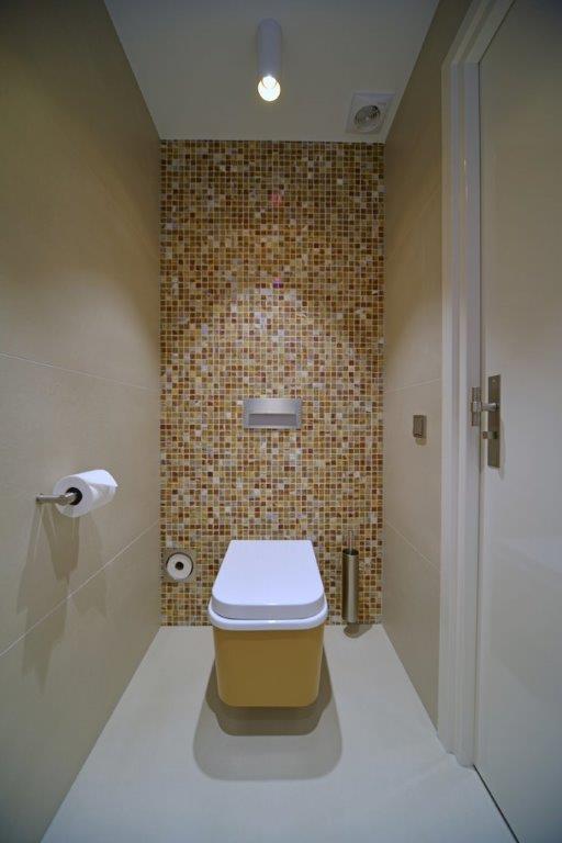 De stijl van de badkamer is doorgevoerd in een aparte toiletruimte met vrijhangend closet, waar als accent is gekozen voor mozaïektegels op de achterwand.