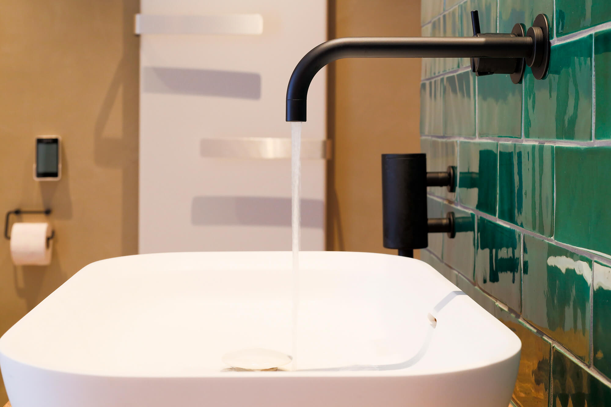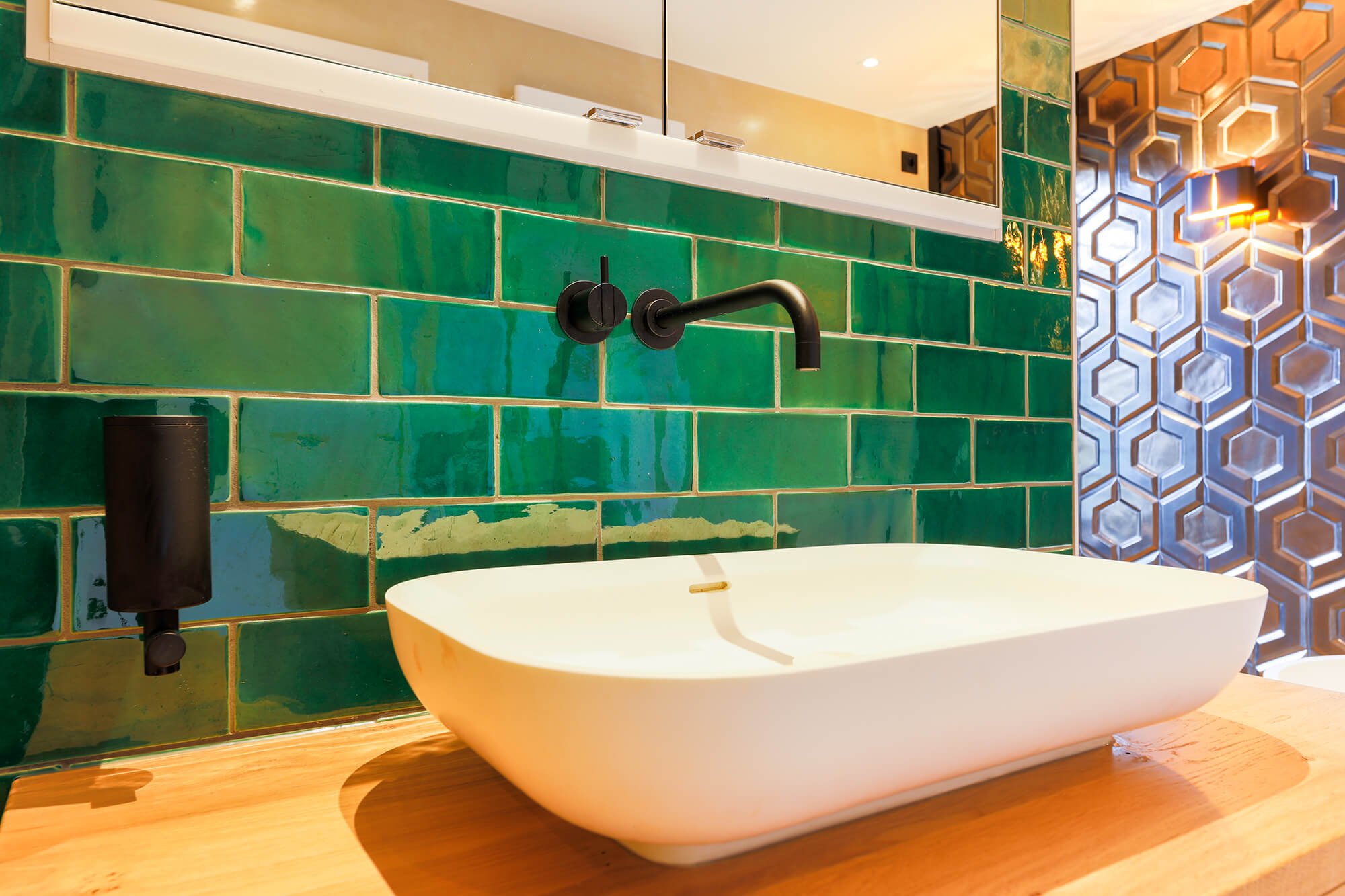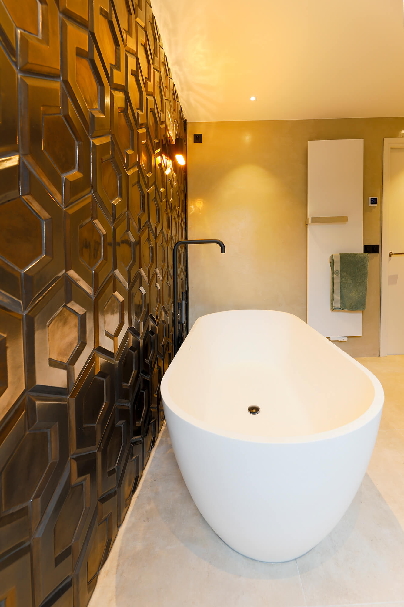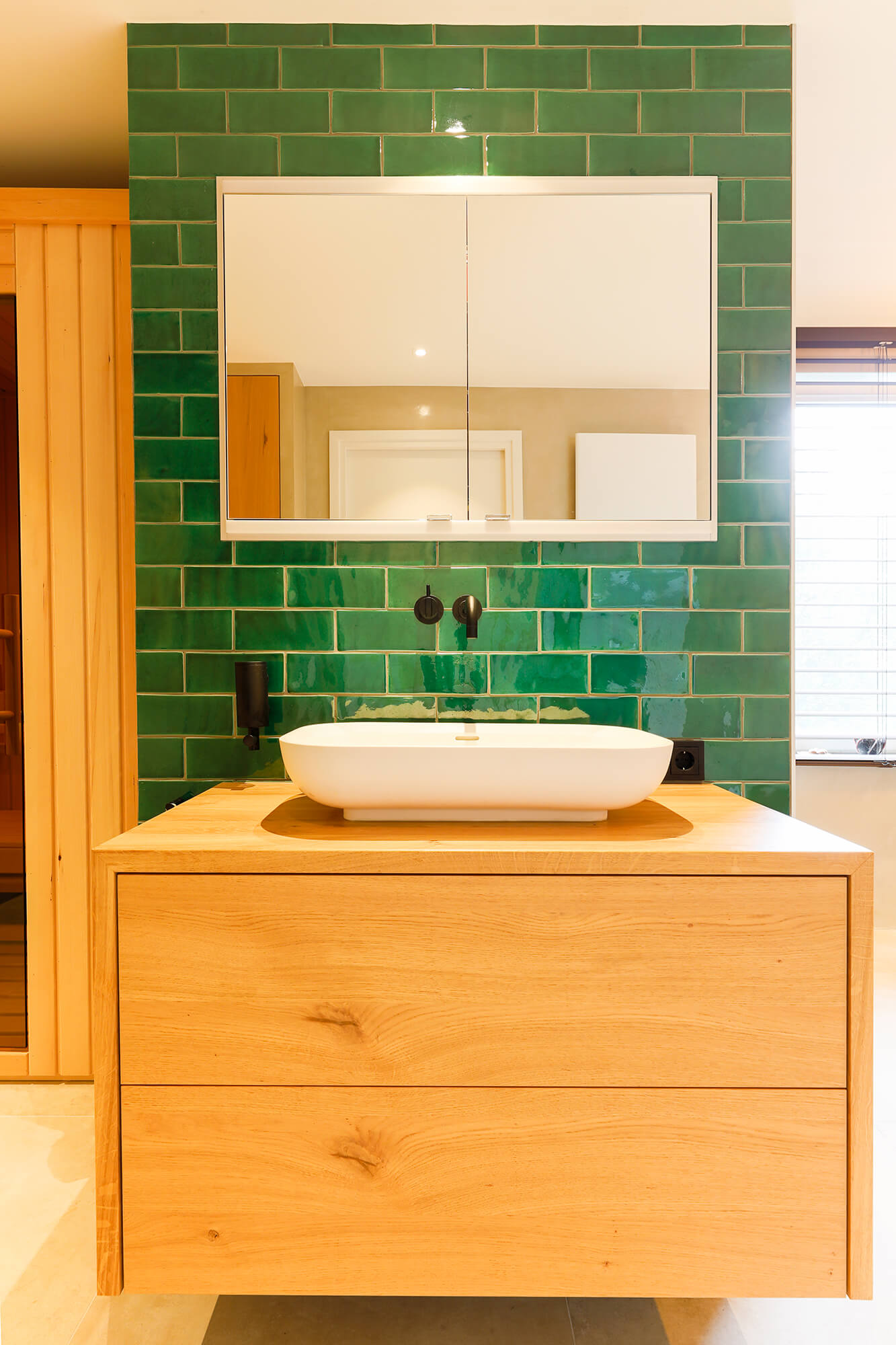 In de badkamer is een infraroodcabine geplaatst om te genieten van de weldaad van wellness in de eigen woning. Het massieve hout van deze zogeheten ‘droge sauna’ is doorgevoerd in het maatwerkmeubel met waskom. De smaragdgroene hoogglans metrotegels vormen een fraai contrast met de houttinten. En de zeskantige geometrische retrotegels zijn, in combinatie met het ingetogen vrijstaande bad, een schitterende eyecatcher. Het aanbrengen was een precisiepuzzel, maar het eindresultaat is dan ook prachtig.